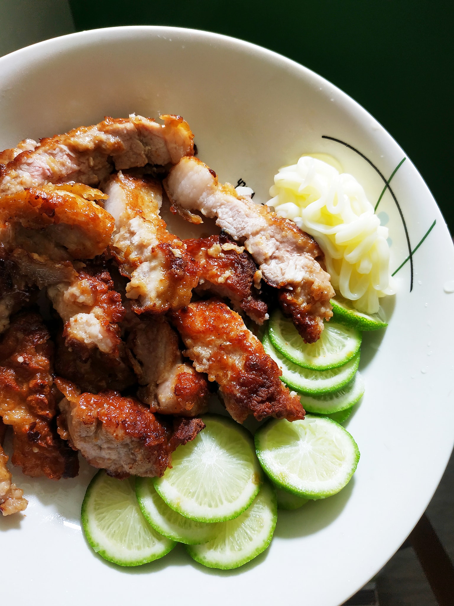 剛剛先把這週新作好的五花燒肉退冰,直接切好用一點油來煎,什麼都沒加,放上新鮮的生菜,直接配白飯就好。
